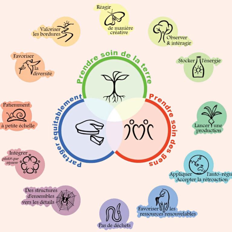 La permaculture est un concept qui consiste à recréer des systèmes cycliques de type écosystémique et global. Elle est basée sur des éthiques dont 3 importantes (être attentif à l’homme, être attentif à la terre, redistribuer les surplus) et des principes. Elle utilise une méthodologie appelée « design » pouvant s’appliquer à plusieurs domaines comme l’industrie, la communication ou encore les logements et qui intègre aussi ces éthiques :